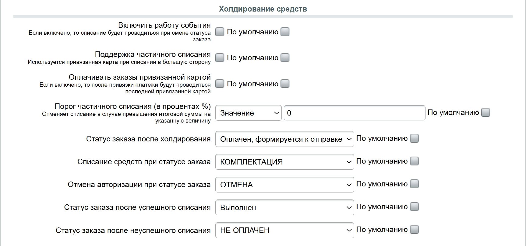 Выберите из списка статус, который будет присвоен заказу после холдирования (авторизации) средств оплаты.
