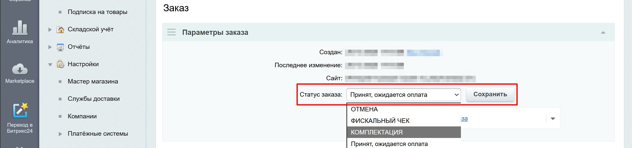 5.5. При двухстадийных платежах необходимо менять статус заказа в административной панели CRM 1С-Битрикс в соответствии с настройкой, чтобы управлять событиями списания или отмены.